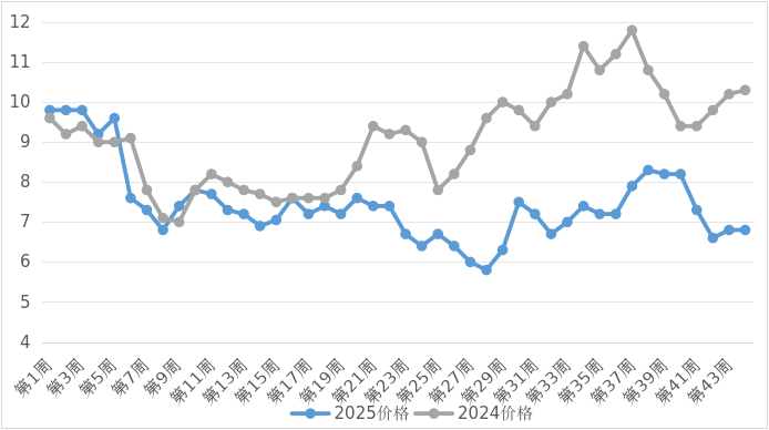 2025年以来,蓬莱区鸡蛋价格整体呈现高位开局、震荡下探、中期企稳、后期再度承压的运行态势,与2024年同期相比,价格重心显著下移。纵向对比来看,2025年价格波动频率高、幅度大,多数时间运行于7-8元/公斤区间。横向对比来看,2025年价格在绝大多数周次低于2024年同期水平,尤其在年中及秋季时段,价差一度非常显著,反映出本年供需矛盾的转化,供大于求。据调查蓬莱嘉泉蛋鸡场,当前蛋鸡养殖的成本约为7元/公斤左右,目前出厂价在5.9元/公斤左右,处于严重亏损状态。