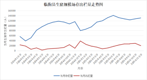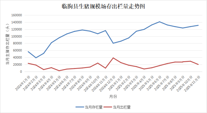据11月份生猪规模场监测数据,临朐县143个规模场共存栏生猪131122头,比上月增长2.80%,比去年同期增加12.80%。生猪出栏20098头,比上月减少31.17%,比去年同期增加108.66%。虽然11月份生猪出栏出现了大幅下降,但仍然远高于去年同期,生猪出栏过剩导致生猪价格反弹困难。因为生猪价格长时间低迷,养殖场户补栏积极性有所下降,仔猪购买量环比减少24.19%,但同比仍然增加33.55%。购买仔猪育肥模式的养殖场多饲喂合同猪,虽然生猪价格震荡下行,但因为饲喂合同猪有较为稳定的利润,补栏量仍然较大,导致生猪产能居高不下,加剧了生猪价格的下行压力,不利于生猪价格的恢复上涨。从监测数据看,11月份5月龄以上生猪存栏10807头,环比降低15.43%,同比降低49.06%,生猪供应量下降,有利于缓解当前生猪价格的颓势。
