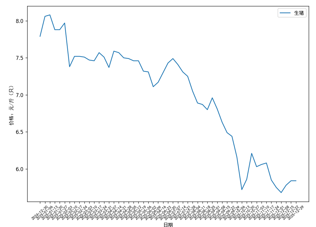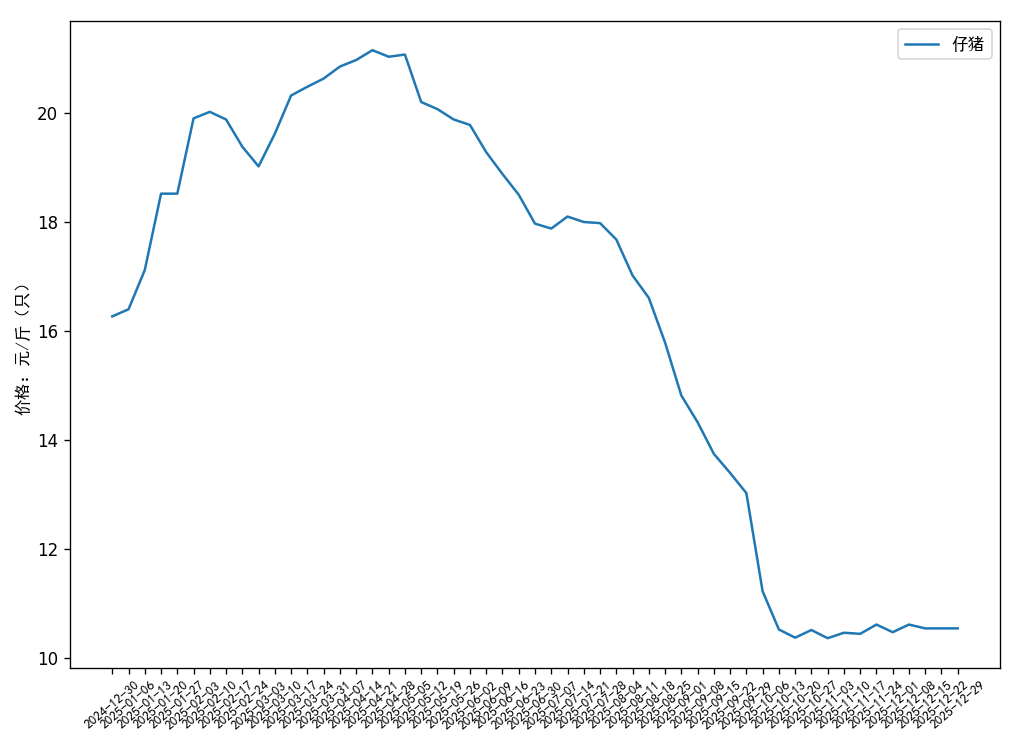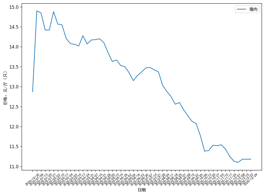 3、猪肉价格。进入2025年,受节日刺激,猪肉价格出现短暂上涨,最高接近30元/kg,春节后开始下降,并且猪肉价格持续走低,进入四季度跌到低谷,不足20元/kg。目前猪肉价格在20元/kg上下浮动,最低价格达到18元/kg。