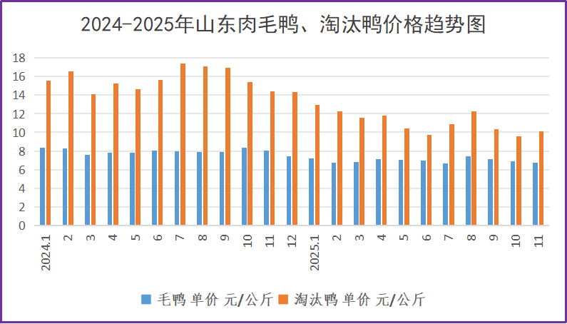 本周肉鸭价格弱势向下,毛鸭市场均价约6.30-6.80元/公斤。12月以来,随着全品相鸭产品提振动力不足,暖冬预期鸭毛需求走弱,鸭毛供需格局主动权倾向采购端,价格遇冷逐渐回落。基于鸭毛价格对效益支撑减弱,传统淡季下冻产品也无利好因素支撑价格,屠宰端开始针对养殖端实施进一步限价。12月出栏毛鸭平均成本是本年度第二高,多点超过了7.20元/公斤,局部高点逼近7.40元/公斤,2025年最高的月份是9月份7.68元/公斤,2025年1-11月毛鸭平均价格7.04元/公斤。肉鸭养殖陷入小幅亏损状态。