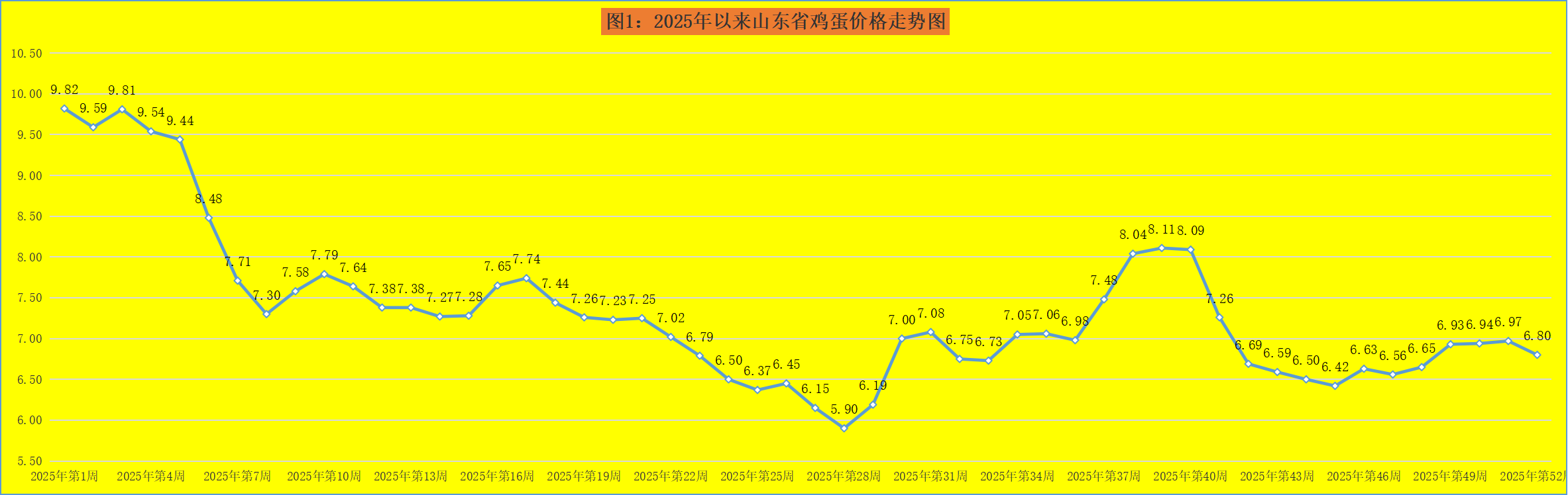 第52周,鸡蛋价格承压回落,弱势走低。本周,我省鸡蛋周销售均价为6.80元/公斤,同比降低31.31%,环比降低2.44%。就全省监测的26个价格县来看,本周我省最高价在阳信县,为7.50元/公斤;最低价出现在郓城县,为6.10元/公斤。当前我省蛋鸡养殖的完全成本约为6.8-7.0元/公斤左右,蛋价低位震荡,部分蛋鸡养殖场户因为鸡蛋销售渠道较为固化,消费场景拓展不足,当前蛋价实现现金成本,仍处于亏损综合成本状态。