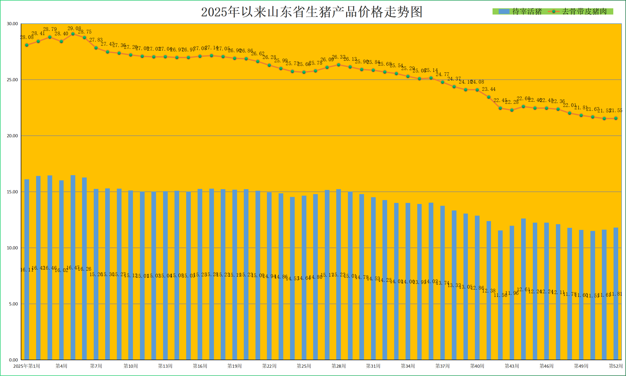 第52周(12月22日-12月28日),我省肥猪价格继续回升,小幅向上。据全省26个畜禽生产定点监测县监测,第52周全省肥猪出栏均价为11.81元/公斤,同比降低25.44%,环比升高1.72%。本周猪肉价格小幅反弹,向上回升。本周我省猪肉均价为21.55元/公斤,同比降低22.62%,环比回升0.09%。