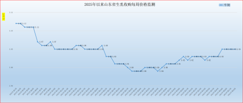 第52周(12月22日-12月28日),生乳价格连续3周企稳,反映供需持续盘整蓄势。本周我省生乳均价为3.05元/公斤,同比降低2.24%,环比持平。在我省监测的26个县中,剔除3个无效数据,有7个县的价格大于或等于全省平均价格,有16个县的生乳价格低于全省平均价格。其中最高价格在蓬莱区,为4.60元/公斤;最低价格出现在招远市和郯城县,为2.65元/公斤,最高价与最低价差值为1.95元/公斤,差价与上周相比收窄,低于全省平均价的县市数量仍然过半,奶牛养殖基本面下行压力仍在。蓬莱区为代表的牧场采取自产自销的一体化经营模式,生乳价格保持较高价位,牧场效益较好。从消费层面看,奶农办加工可作为当前乳品消费市场的有益补充。