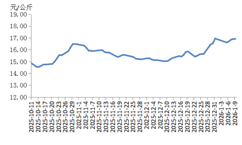 本周华北地区猪肉价格环比微涨。周初适逢元旦过后,猪肉消费较弱,价格下跌。周内散养户压栏增重,规模养殖场出栏量有限,支撑生猪及猪肉价格止跌反弹。临近周末,消费市场对高价猪肉的接受量有限,屠宰企业订单量减少,价格微跌。总体看,本周华北地区猪肉周均价环比微涨。