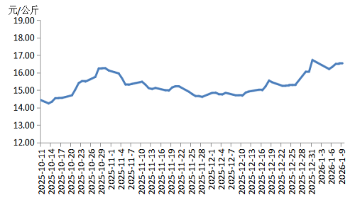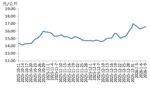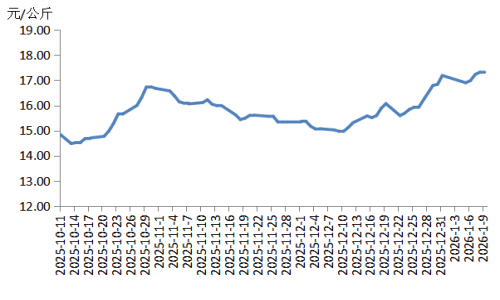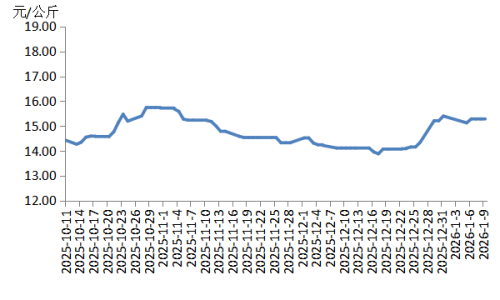 本周华东地区猪肉价格环比小幅上涨,周内价格先跌后涨。周初适逢元旦过后,猪肉订单量明显减少,价格下跌;周中后期,规模养殖场出栏量减少,生猪及猪肉供应收紧,支撑生猪及猪肉价格上涨。