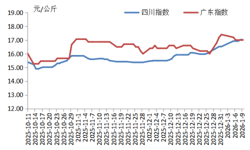 本周,四川地区猪肉周均价为每公斤16.97元,环比上涨2.9%,同比下跌24.3%,较上周跌幅收窄2.5个百分点。规模养殖场和散养户抗价惜售,生猪及猪肉供应减少;四川腌腊活动高峰期已过,猪肉消费略减,消费减幅小于供应减幅,价格上涨。