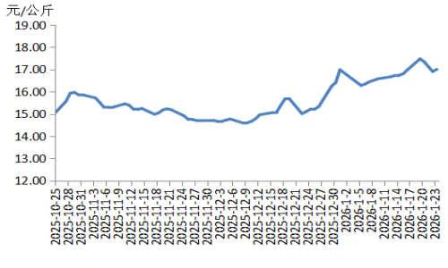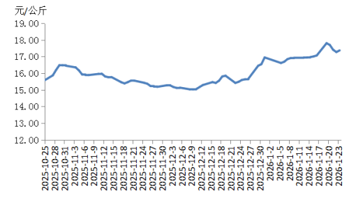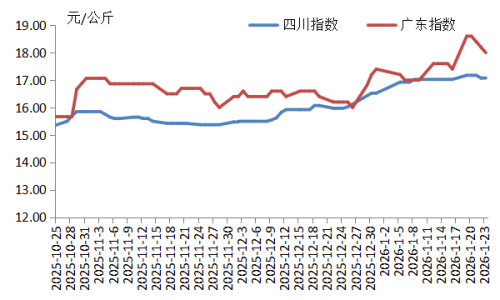 2026年第4周(即2026年1月19日-1月23日,以下简称本周),16省(直辖市)瘦肉型白条猪肉出厂价格总指数的周平均值为每公斤17.51元,环比上涨3.1%,同比下跌18.0%,较上周跌幅收窄1.1个百分点。