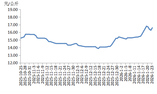 本周国内瘦肉型白条猪肉出厂价格(以下简称“猪肉价格”)环比上涨。周初,部分地区降雪天气使得屠宰企业收购生猪数量减少、单价上涨,支撑猪肉价格明显上涨。周中期,随着道路逐渐通畅,屠宰企业收购生猪速度加快,猪肉供应紧张状况缓解,价格高位回落。周末期,规模养殖场和散养户抗价惜售,叠加临近腊八需求略增,支撑猪肉价格小幅反弹。总体看,本周白条猪肉周均价高于上周。