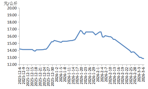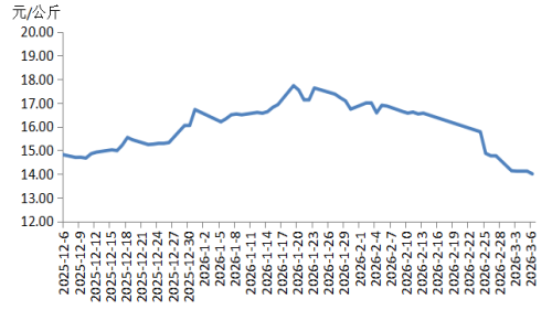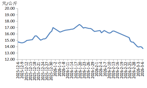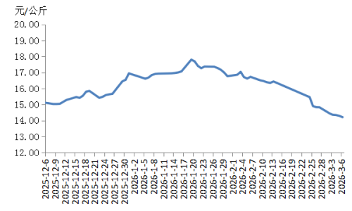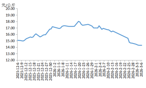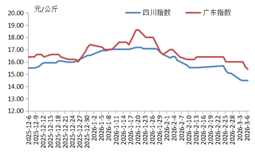 2026年第10周(即2026年3月2日-3月6日,以下简称本周),16省(直辖市)瘦肉型白条猪肉出厂价格总指数的周平均值为每公斤14.33元,环比下跌4.5%,同比下跌25.1%,较上周跌幅扩大3.3个百分点。