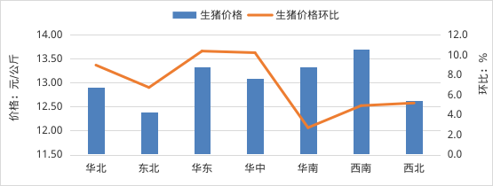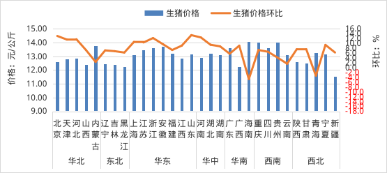 全国生猪平均价格13.07元/公斤,同比跌21.3%,环比涨7.4%。从涨跌情况看,山东、北京、河南、浙江、河北等28个省份价格上涨,海南、青海价格下跌。其中,华东地区环比涨幅较大,山东领涨,涨幅为13.4%;从价格水平来看,西南地区生猪平均价格最高,为13.70元/公斤;东北地区最低,为12.39元/公斤。