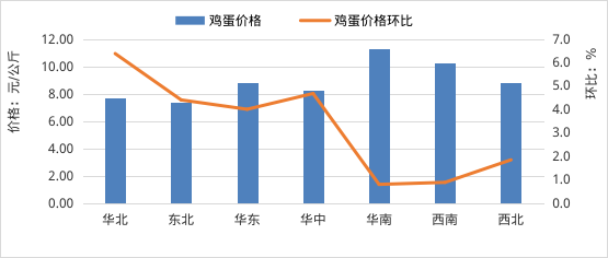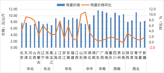 全国鸡蛋平均价格8.87元/公斤,同比跌19.5%,环比涨3.1%。河北、辽宁等10个主产省份鸡蛋平均价格7.67元/公斤,同比跌23.1%,环比涨6.7%。从涨跌情况看,河南、山东、天津、河北、山西等29个省份价格上涨,云南价格下跌。其中,华北地区环比涨幅较大,天津领涨,涨幅为9.2%;从价格水平来看,华南地区鸡蛋平均价格最高,为11.33元/公斤;东北地区最低,为7.35元/公斤。