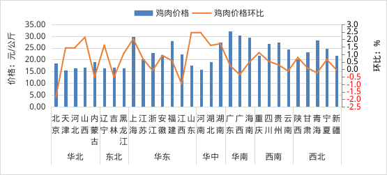 各省(区、市)鸡肉价格及环比增减情况图