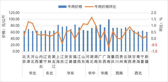 全国牛肉平均价格71.64元/公斤,同比涨9.0%,环比涨0.4%。河北、辽宁、吉林、山东和河南等主产省份牛肉平均价格为65.50元/公斤,同比涨20.5%,环比涨0.5%。从涨跌情况看,华中地区环比涨幅较大,湖北领涨,涨幅为1.7%;华南地区环比跌幅较大,海南领跌,跌幅为0.6%。