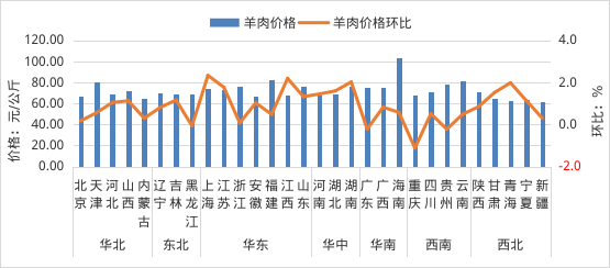 各省(区、市)羊肉价格及环比增减情况图