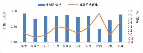 内蒙古、黑龙江等10个主产省份生鲜乳平均价格3.03元/公斤,同比跌2.9%,环比持平。