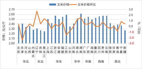 各省(区、市)玉米价格及环比增减情况图
