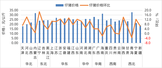 全国仔猪平均价格24.99元/公斤,同比跌26.4%,环比涨6.8%。从涨跌情况看,辽宁、河北、陕西、福建、浙江等26个省份价格上涨,青海、海南、云南价格下跌。其中,华东地区环比涨幅较大,福建领涨,涨幅为13.5%。从价格水平来看,华南地区仔猪平均价格最高,为28.39元/公斤;华北地区最低,为23.17元/公斤