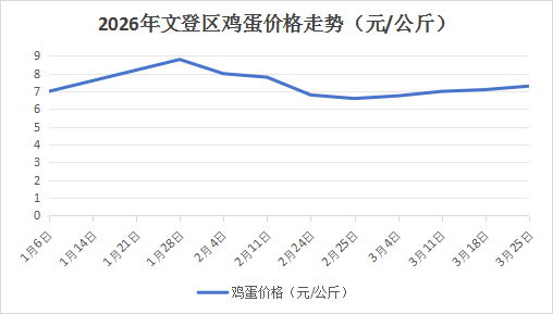 据文登区行业数据统计,2026年度一季度蛋鸡存栏量为289.25万只,同比下降4%,蛋鸡存栏规模小幅收缩。同期,文登区鸡蛋市场价格呈现“先升后降再回暖”的阶段性走势,整体波动特征较为显著。具体可分为三个:
