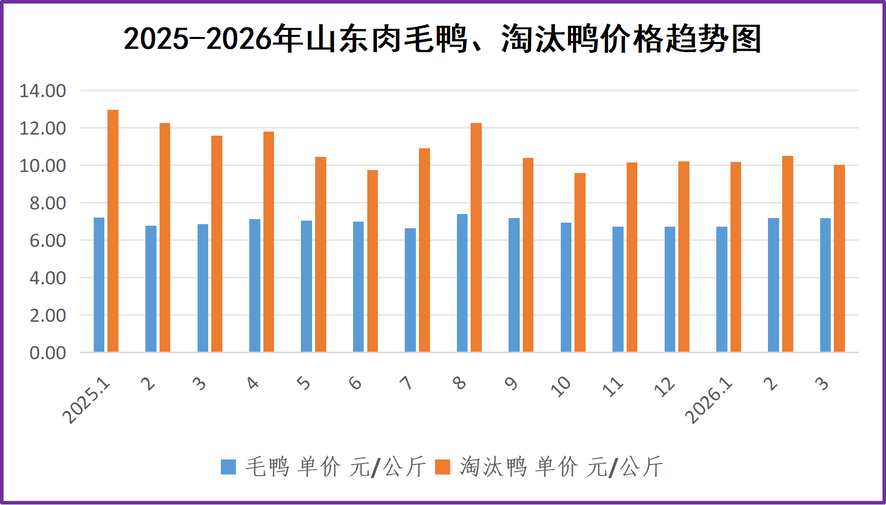 成本核算:根据2026年一季度生产资料价格计算:大鸭,以饲养36-37天,出栏毛鸭3公斤为例,只鸭成本约19.1元/只,合毛鸭6.4元/公斤,其中饲料15.5元,苗1.5元,药费0.5元,人工0.8元,其它0.8元。小鸭,以饲养25-27天,出栏1.8公斤为例,只鸭成本约11.5元/只,合毛鸭6.4元/公斤,其中饲料8.5元,苗1.4元,药费0.4元,人工0.6元,其它0.6元。