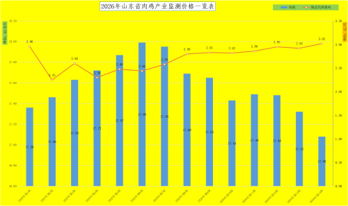 行情走势:整体看,2026年一季度鸡肉价格呈现倒“V”型走势,由1月初涨至2月上旬的高位后,震荡走低,趋势下行。鸡肉价格由1月初的17.36元/公斤,震荡回升至2月上旬的季度高位,为17.99元/公斤,涨幅4%;随后趋势回落,弱势走低,截至3月底,我省鸡肉均价达到17.08元/公斤,跌幅5%。