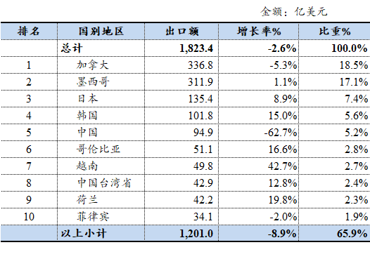 表1 2025年1-12月美国农产品前十位出口国别地区表格
