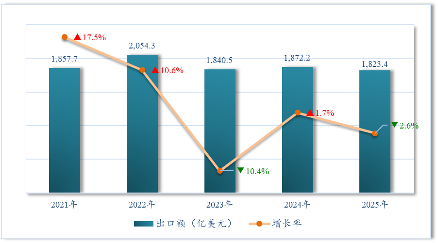 据Bureau of Economic Analysis, U.S. Census Bureau,U.S. Department of Commerce统计,近五年,美国农产品出口额呈现先升后降的波动走势。2021年出口额为1,857.7亿美元,同比增长17.5%;2022年延续增长态势,出口额突破2,054.3亿美元,达到五年峰值,但增速放缓至10.6%。随后2023年大幅回落10.4%至1,840.5亿美元;2024年出口额回升至1,872.2亿美元,同比微增1.7%。2025年再次下滑,出口额1,823.4亿美元,同比下降2.6%。总体来看,2025年出口规模较2022年峰值减少230.9亿美元,基本回落至2021年水平。