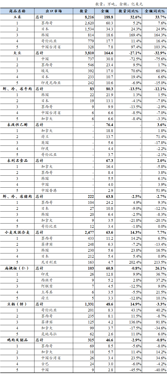 2025年,玉米是美国第一大出口农产品,出口额占比10.4%,同比增长33.7%;大豆位居第二,占比9%,但同比大幅下降32.9%。肉类产品中,鲜冷冻牛肉、猪肉出口额同比分别下降12.1%和2.7%,鸡肉及制品同比微降0.8%。此外,扁桃核(仁)同比增长26.1%,小麦及混合麦、未改性乙醇、未列名食品同比分别增长7.7%、3.6%、2%。