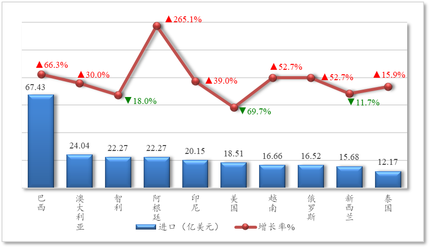 前2个月,我国农产品前十大进口市场进口额合计235.7亿美元,比上年同期增长8.2%,占我农产品进口总额70%。阿根廷、巴西、印尼、越南、俄罗斯等市场进口增长显著,同比分别增长265.1%、66.3%、39%、52.7%和52.7%。而从美国进口同比下降69.7%,智利、新西兰进口也出现下降。巴西仍是第一大进口来源国,占我农产品进口总额20%,澳大利亚、智利、阿根廷、印尼紧随其后,占比均在5%以上。
