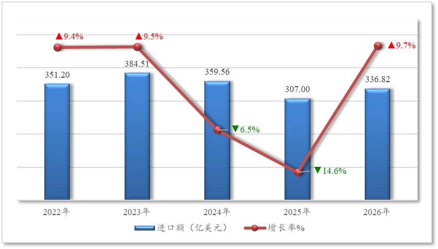 据海关统计,2026年1-2月,我国农产品进口总额336.8亿美元,比上年同期增长9.7%,占全国外贸进口总额7.6%。从近五年同期数据看,2022年至2025年1-2月进口增速分别为9.4%、9.5%、-6.5%、-14.6%,2026年增速由前两年的负增长转为正增长,回升态势较为明显。