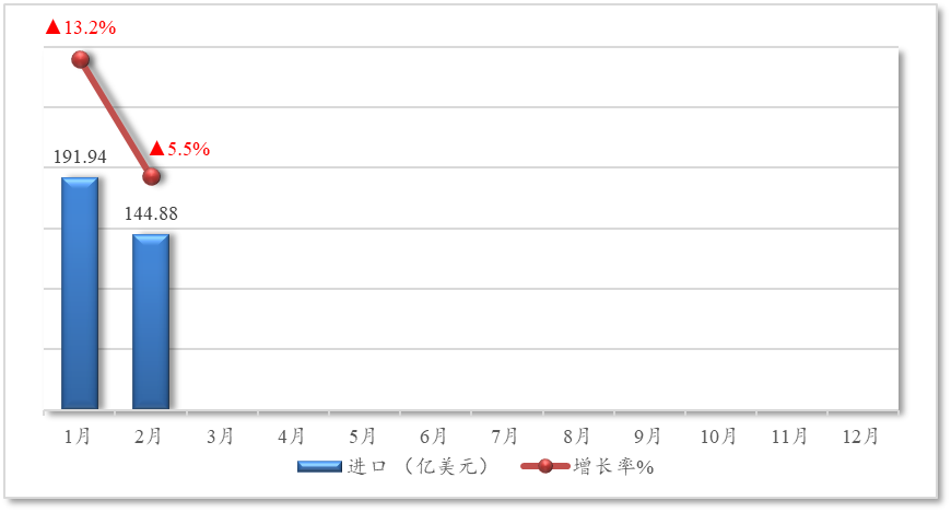 从月度数据看,1月进口同比增长13.2%,2月同比增长5.5%,增速有所放缓。