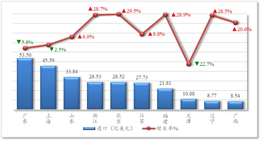 前2个月,国内前十位省市农产品进口额合计267.7亿美元,比上年同期增长7.1%,占全国农产品进口总额79.5%。其中,北京、福建、浙江、辽宁、广西等地进口增速较快,同比分别增长29.5%、28.9%、28.7%、28.5%和20.6%。广东为进口第一大省,占比15.9%,但同比下降5.8%。上海和天津进口也出现下降,降幅分别为2.5%和22.7%。