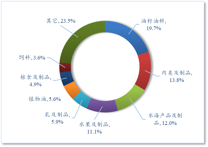 前2个月,主要进口大类农产品中,植物油、粮食及制品、饲料、水海产品及制品、肉类及制品等增长较快,同比分别增长44.3%、37.2%、30%、23.9%和12.7%。油籽油料、水果及制品、乳及制品进口同比下降,降幅分别为7.5%、3.9%和2.5%。从占比看,油籽油料、肉类及制品、水海产品及制品、水果及制品是主要进口品类,分别占我农产品进口总额19.7%、13.8%、12%和11.1%。